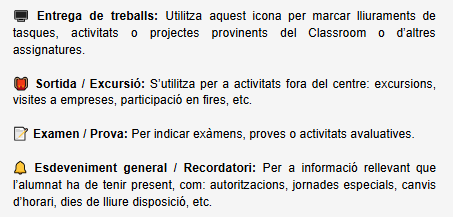 - Seguiment durant el pilotatge: Durant les primeres setmanes, es dedicarà un breu espai de la tutoria per resoldre dubtes o incidències relacionades amb l’ús del calendari.