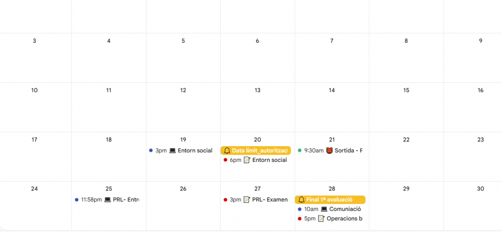 - Centralitzar en un sol espai (Google Calendar) totes les dates d’entregues, exàmens i activitats dels diferents mòduls del PFI.