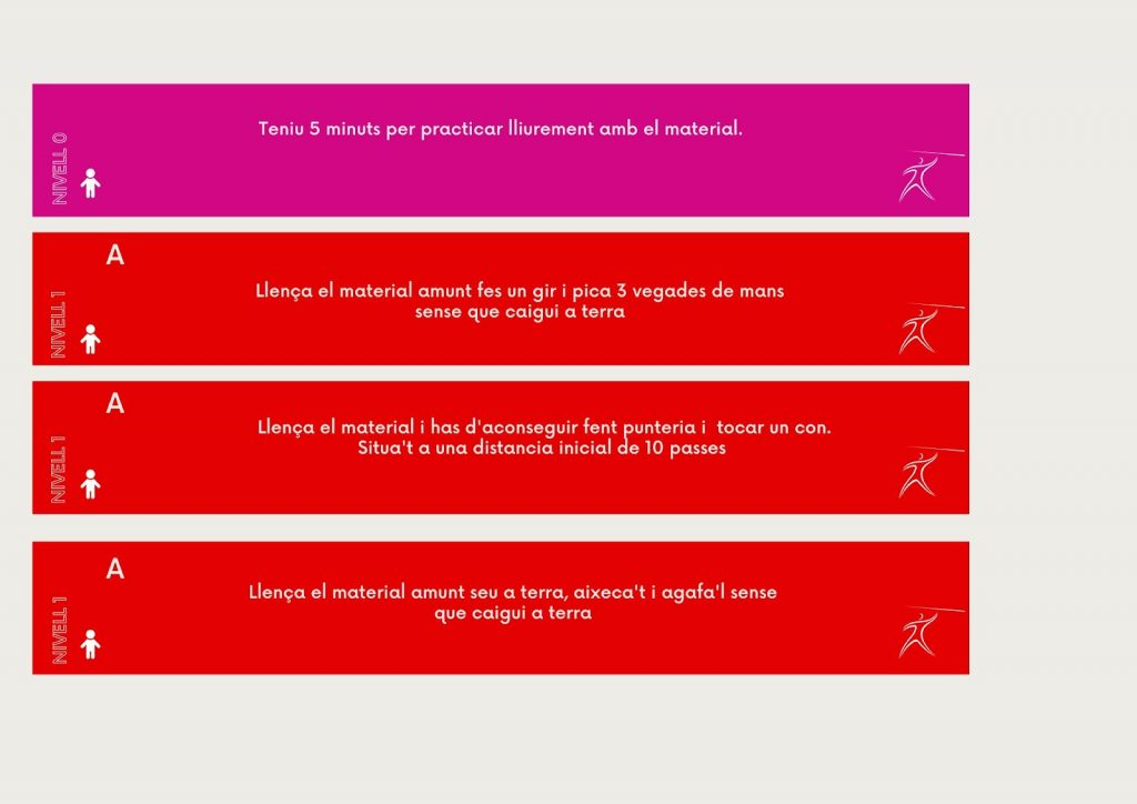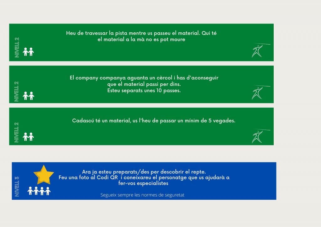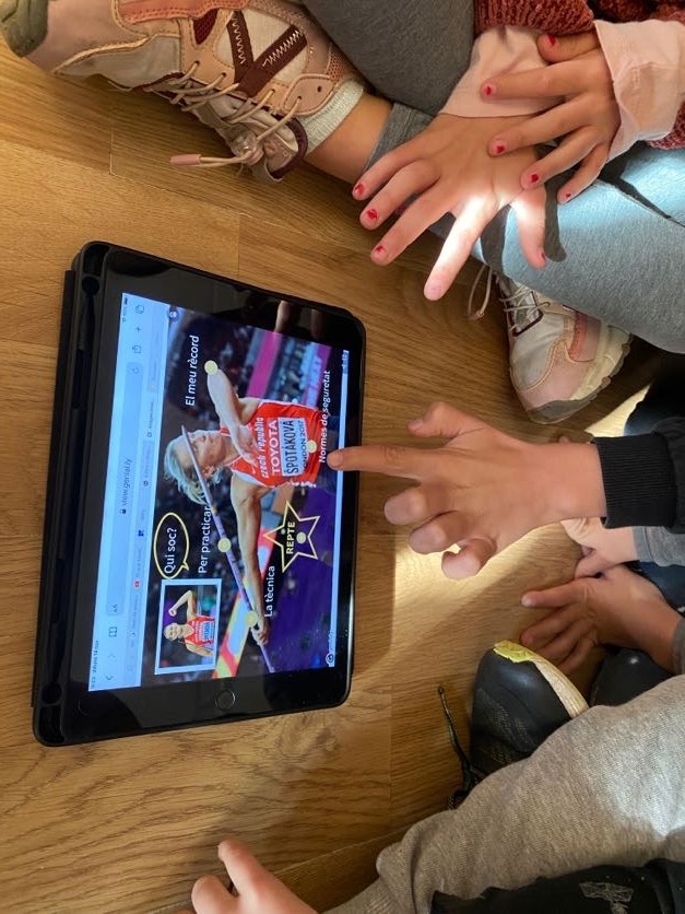 Presentació de diferents reptes en diferents nivells de realització on es plantejaran tasques tan individuals, com per parelles i finalment de tot el grup. S’oferiran en diferents nivells per tal de fer una proposta que s’adapti a les necessitats de cada infant (DUA). Un cop superat aquests reptes, l’alumnat rebrea un codi QR on els redigiran a una imatge interactiva on es presentarà l’atleta de la disciplina que els ha tocat fer-se experts i allà hauran de visualitzar els vídeos, canalitzar i comprendre la informació per posteriorment realitzar la técnica de l’especialitat corresponent.