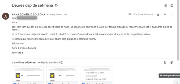 D’acord amb les eines de comunicació establertes al Pla de Comunicació de la meva escola, he utilitzat el correu @xtec, per tal de comunicar-me amb les meves companyes de nivell, tot adjuntant-los els deures que s’han de repartir pel cap de setmana