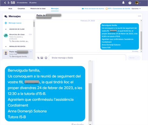 En aquesta segona evidència he utilitzat el ClassDojo per convocar la família d’un alumne de la meva aula a la tutoria de seguiment. No es visualitza la resposta ja que la família em va confirmar la seva assistència en persona, doncs treballo a infantil i a les entrades i sortides sempre hi ha comunicació en persona.
