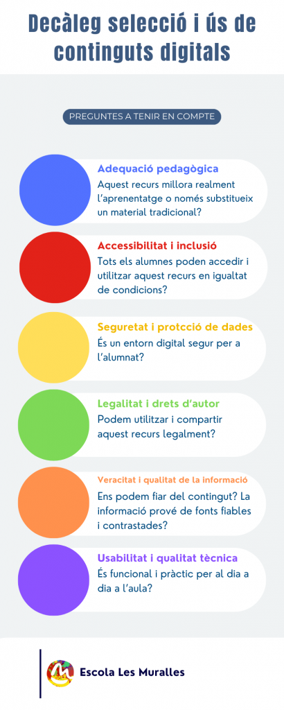 Aquesta situació posa de manifest la necessitat de promoure una mirada crítica en la selecció dels recursos educatius digitals. Tal com assenyala el Projecte Educatiu de Centre, l’escola aposta per metodologies actives, inclusives i participatives que situen l’alumnat al centre del procés d’aprenentatge (Escola Les Muralles, 2019). Per tal que les tecnologies digitals contribueixin realment a aquest objectiu, és important que el professorat utilitzi els materials digitals de manera reflexiva i coherent amb els plantejaments pedagògics del centre.