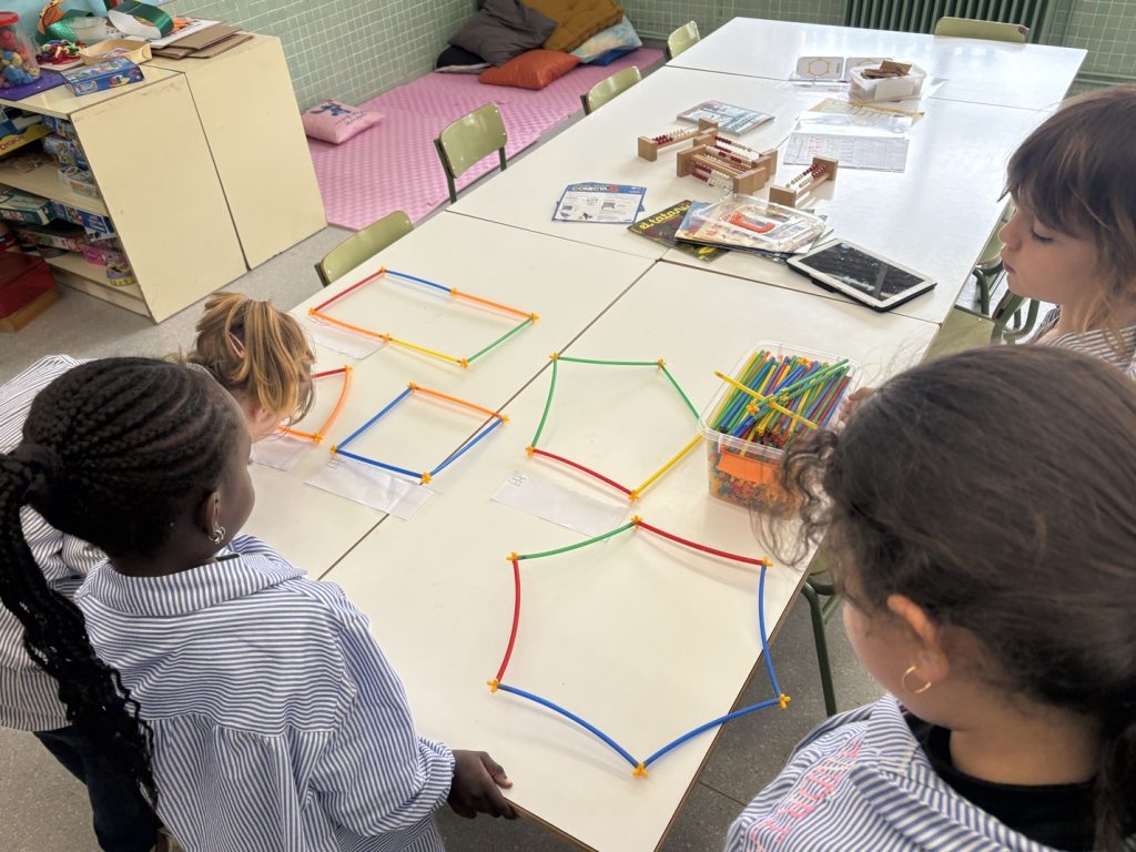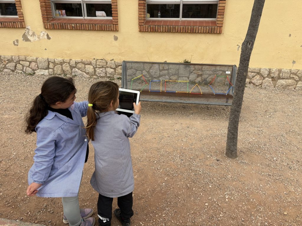 Del text a la imatge: en lloc de respondre preguntes sobre un dibuix en un paper, l’alumnat va passar a “caçar” la geometria en el seu entorn real (el pati) i a construir-la amb les seves mans (material manipulatiu).