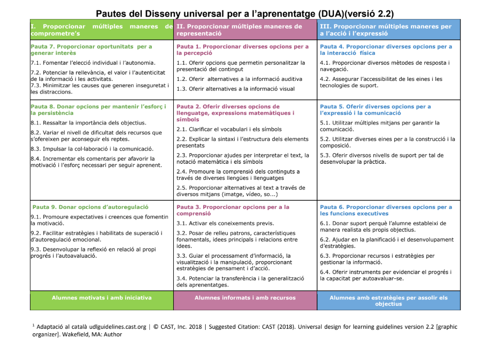 El Disseny Universal d’Aprenentatge es perfila com un conjunt de bones praxis amb les que planificar activitats en les que tots els alumnes tinguin oportunitats de participar, “oferint que presentin opcions que es puguin personalitzar, que permetin a tots els estudiants progressar des d’on ells estan i no des d’on nosaltres imaginem que estan” (Rose, Gravel i Gordon, 2014). Ens n’assegurarem afavorint la diversitat de suports, el seguiment de dinàmiques de treball cooperatiu, on els coneixements siguin productius, permanents, significatius i transferibles. Serà així com farem de la diversitat la norma, i no l’excepció.