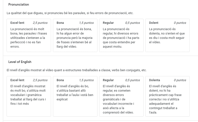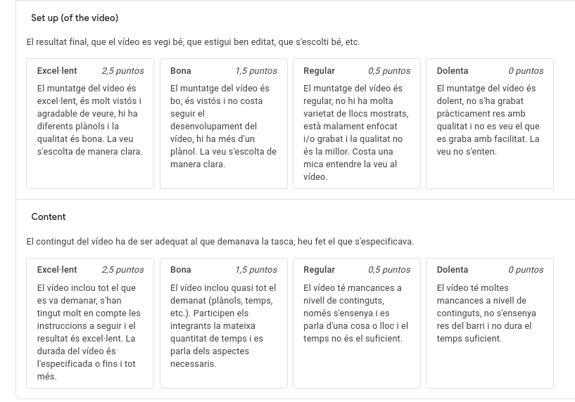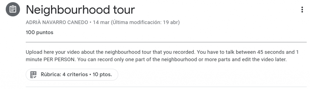 Per poder dur-ho a terme hem realitzat una activitat amb el curs de primer d’ESO on s’ha pogut implementar una rúbrica que avalua diferents aspectes. L’activitat en qüestió tractava de realitzar un vÃdeo d’aproximadament un minut on han de mostrar una part del barri i fer-ne una exposició en anglès. Se’ls va demanar que pengessin el vÃdeo a una tasca de Google Classroom, al qual hi estan apuntats tots els alumnes de la classe. La rúbrica també es va definir a partir de la mateixa tasca de Google Classroom.