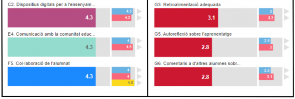 Els àmbits millorables són els àmbits de l’assistència tècnica, la participació amb projectes interdisciplinaris o el de la coavaluació, autoavaluació i pràctiques d’avaluació amb eines digitals. Alguns d’aquests aspectes es potencien molt en alguns cicles però no tant en altres. Per això, un dels nostres objectius anirà encaminat en consolidar la línia d’escola en l’àmbit digital per tal de potenciar la competència digital de l’alumnat.