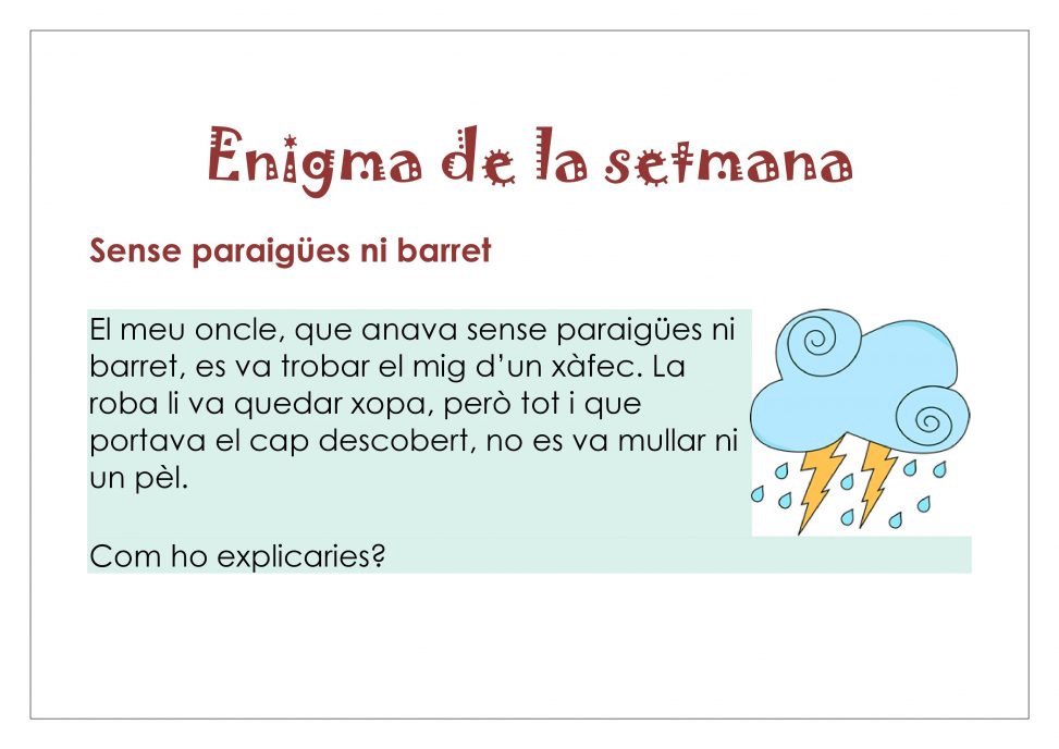 Hola, sóc l’Amira i la resposta de l’enigma és que el senyor era calb, i per això no se li va mullar ni un pèl.