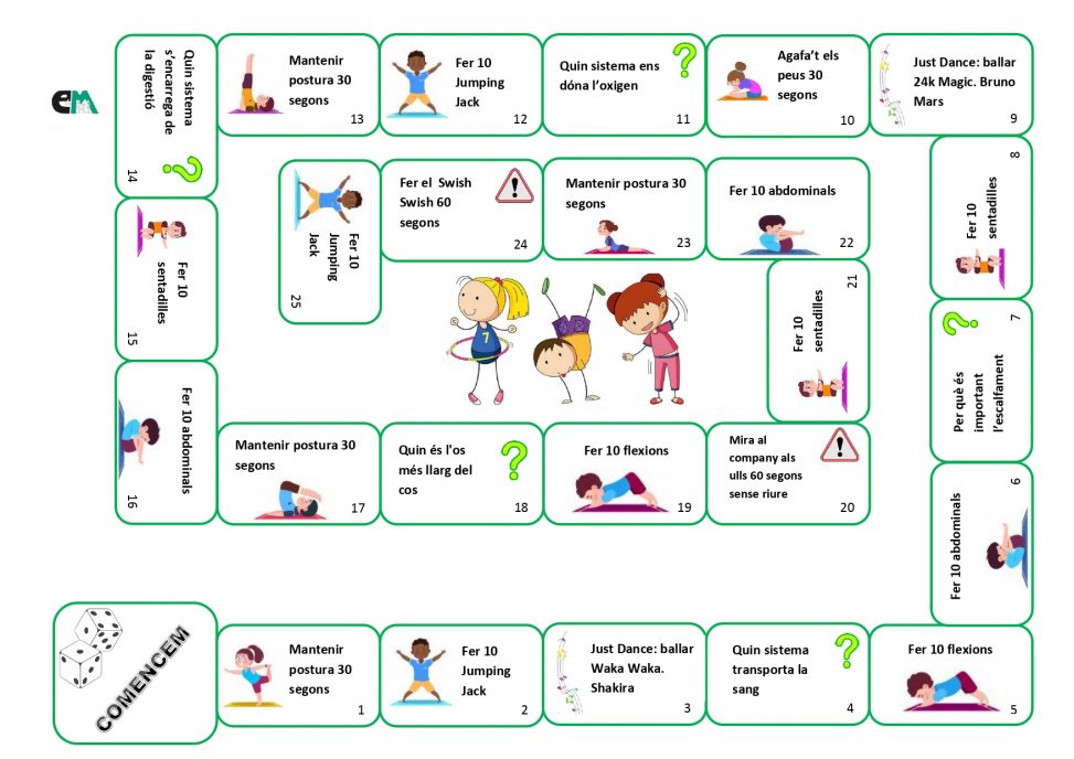 Aquí teniu una proposta per a realitzar activitat física a casa i treballar els continguts que heu vist fins ara en Educació Física. És un joc de taula per al qual es recomana imprimir el full del tauler, un dau i unes fitxes o bé figures que representin a cada jugador. Guanyarà i aconseguirà un punt el primer que completi tot el recorregut. Enfrontant-se als reptes que es vagi trobant durant tot el camí.