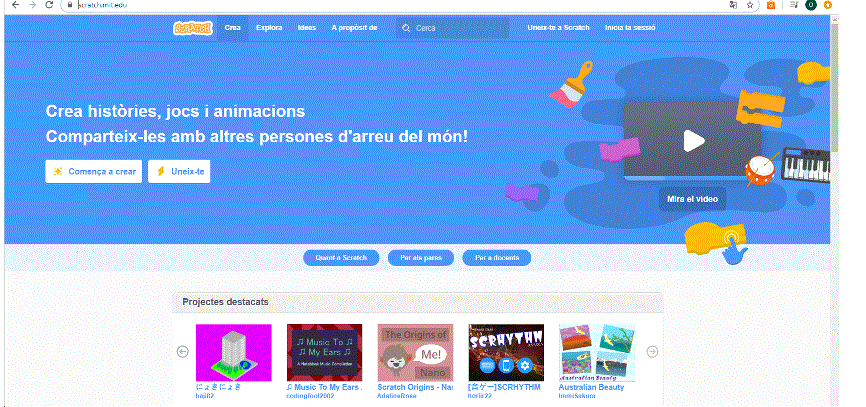 Per poder programar-ho només cal que obriu la pàgina d’Scratch https://scratch.mit.edu/ i cliqueu a la pestanya de crea.