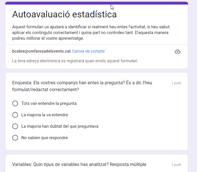 - Google quiz: al final de la tasca s’haurà de fer una autoavaluació utilitzant aquesta eina digital per valorar com s’ha treballat i si han assolit els objectius. Quiz