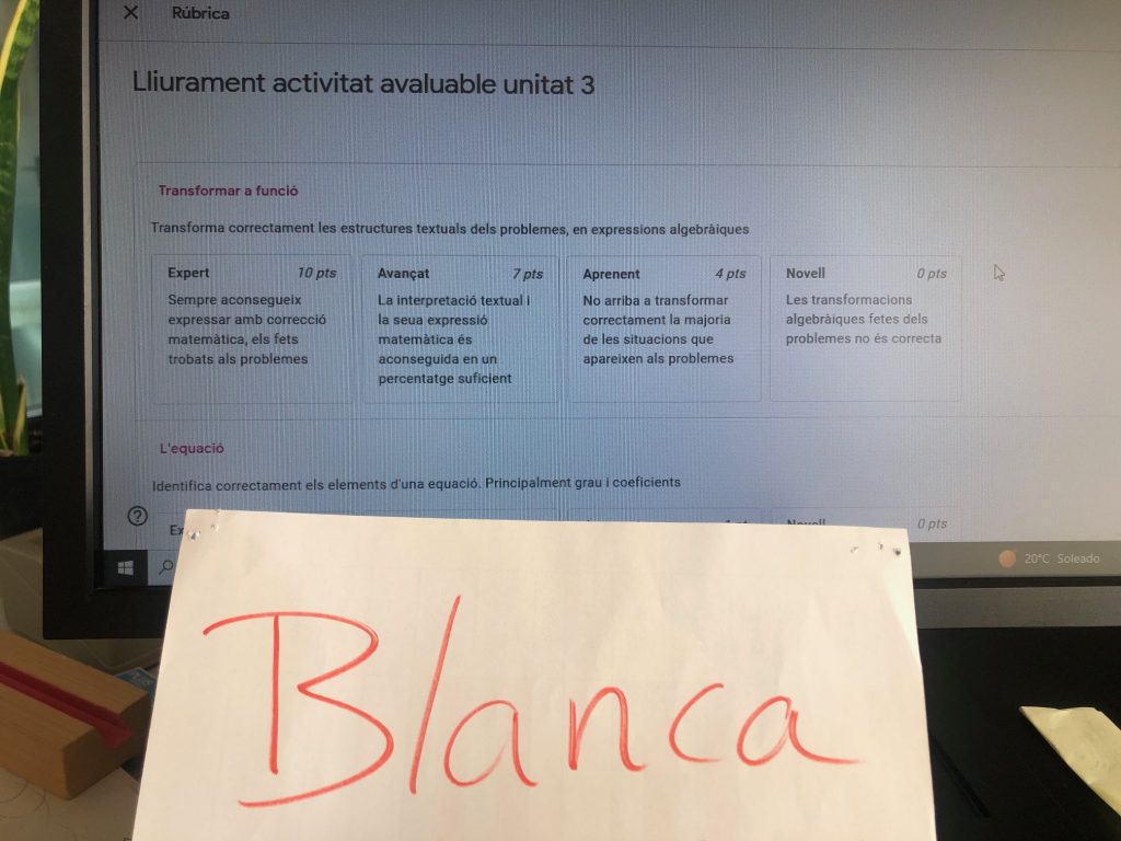 En el meu cas he elaborat la rúbrica utilitzant la plataforma del Classroom. Consta de 7 criteris d’avaluació i 4 nivells (expert, avançat, aprenent i novell)