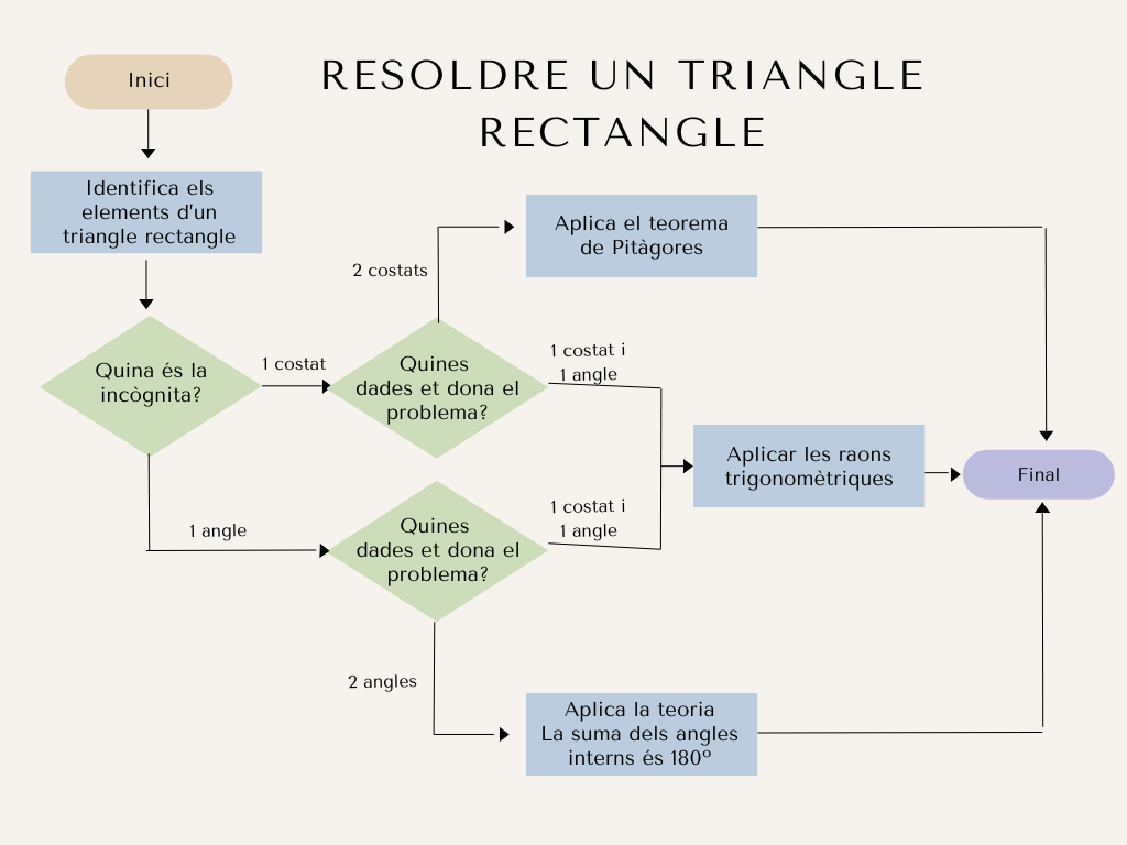 He decidit crear un diagrama de flux per establir un procés per a la resolució d’un triangle rectangle. La qüestió que ajuda a resoldre el diagrama de flux és: