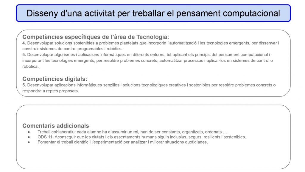En aquest bloc he dissenyat una proposta d’aula per als alumnes del mòdul de Tecnologia del GESO nivell II que busca desenvolupar diferents estratègies del pensament computacional dins del context del mòdul.