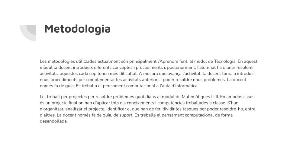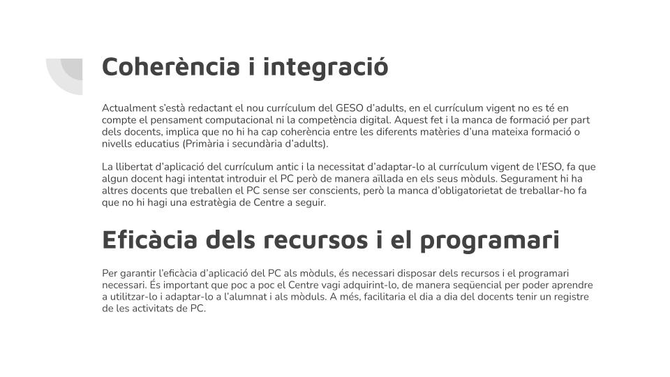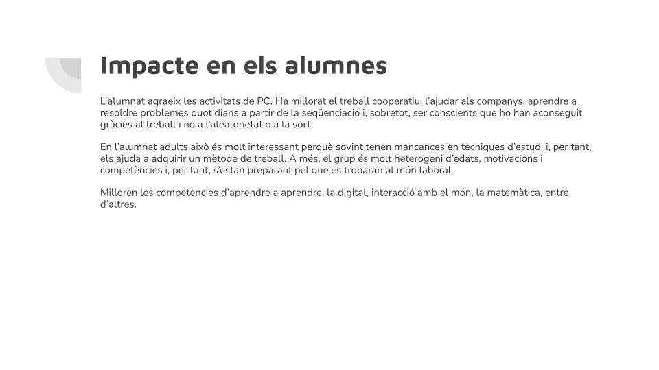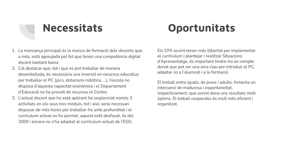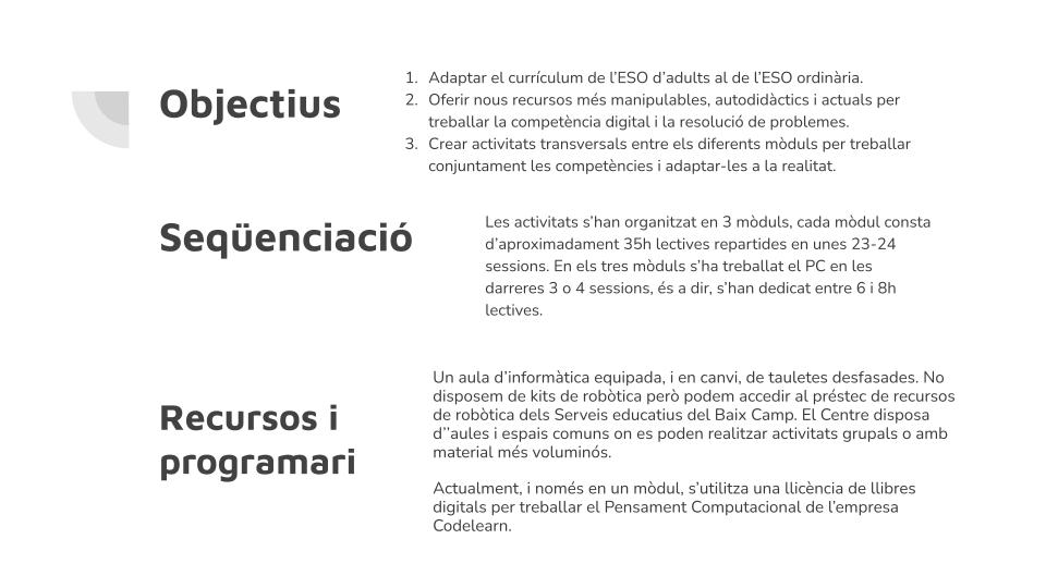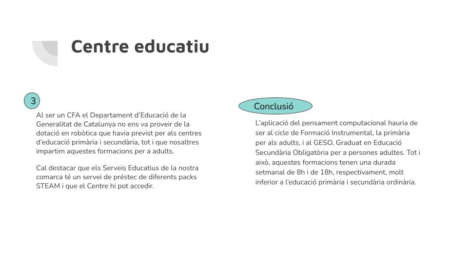 Els principals punts febles que tenim: primer, és que estem pendents de la publicació del nou currículum del Graduat en Educació Secundària Obligatòria per a les persones adultes i el currículum actual és del 2009. És a dir, actualment no tenim documentat res sobre el pensament computacional però ens hem d’adaptar al màxim al currículum actual de l’ESO. Segon, la manca de formació dels docents en l’àmbit digital i, per descomptat, en el pensament computacional. Tercer, no ens ha arribat la dotació en robòtica del Departament d’Educació.