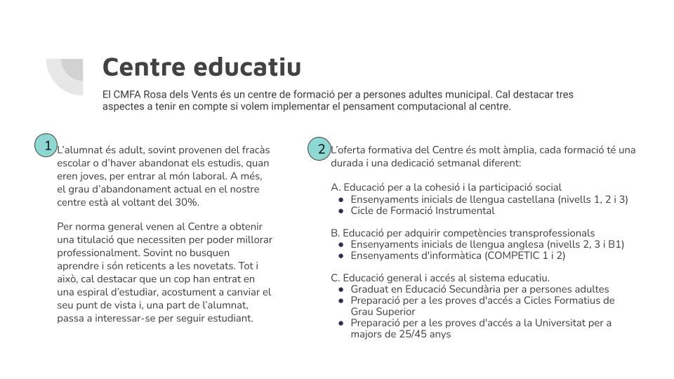 La implementació del Pensament Computacional en el meu Centre, un Centre de Formació d’Adults Municipal, encara es troba en la fase inicial.