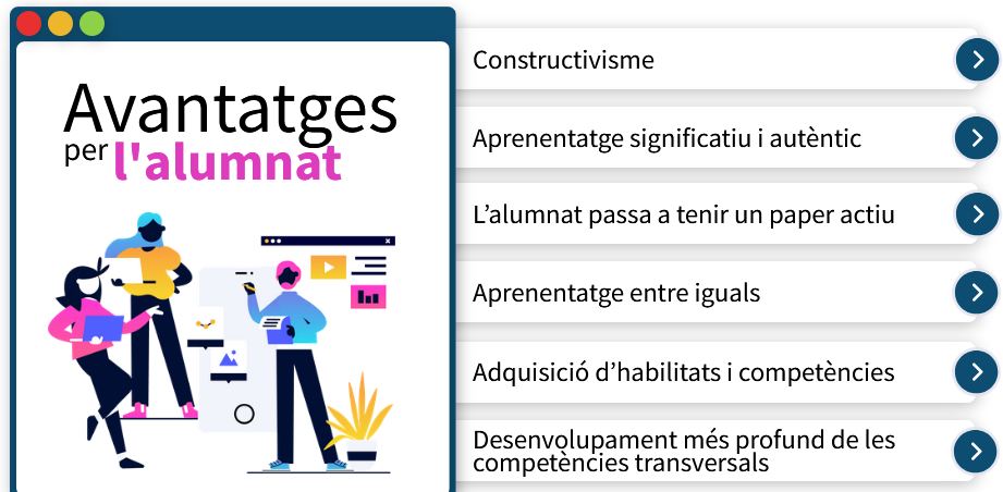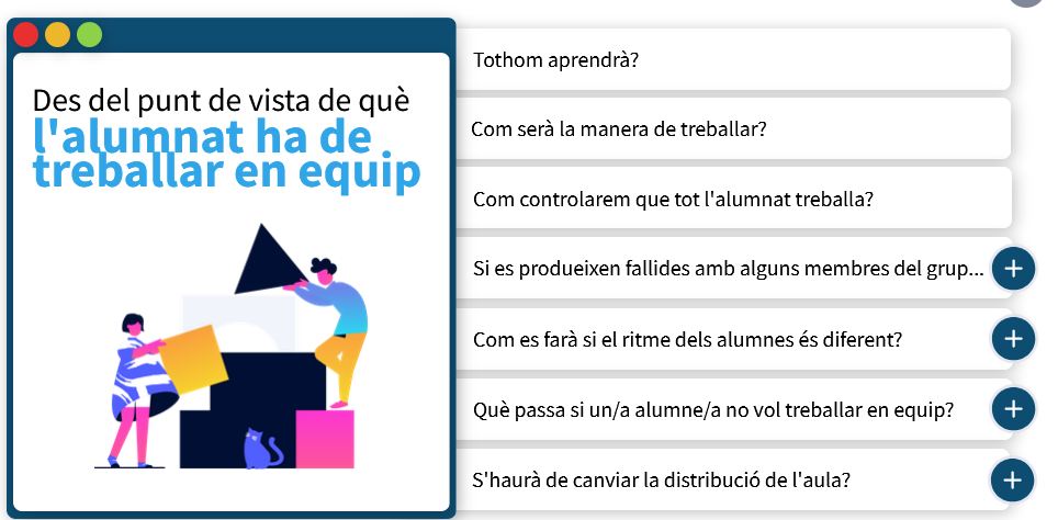 • 6 L’alumnat treballarà en equip. Treballar en equip farà que l’alumnat treballi les competències claus, personals i socials, ja que hauran d’organitzar i planificar les tasques a realitzar, treballar les relacions interpersonals, etc. I a més, en el món laboral generalment es treballa en equip i aquest aprenentatge cooperatiu entrena en habilitats de comunicació i relacions interpersonals necessàries per a la labor d’equip.