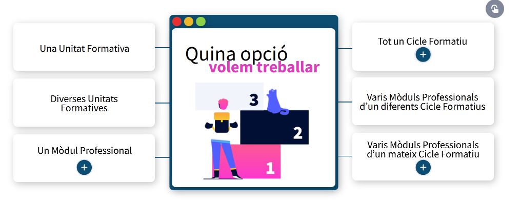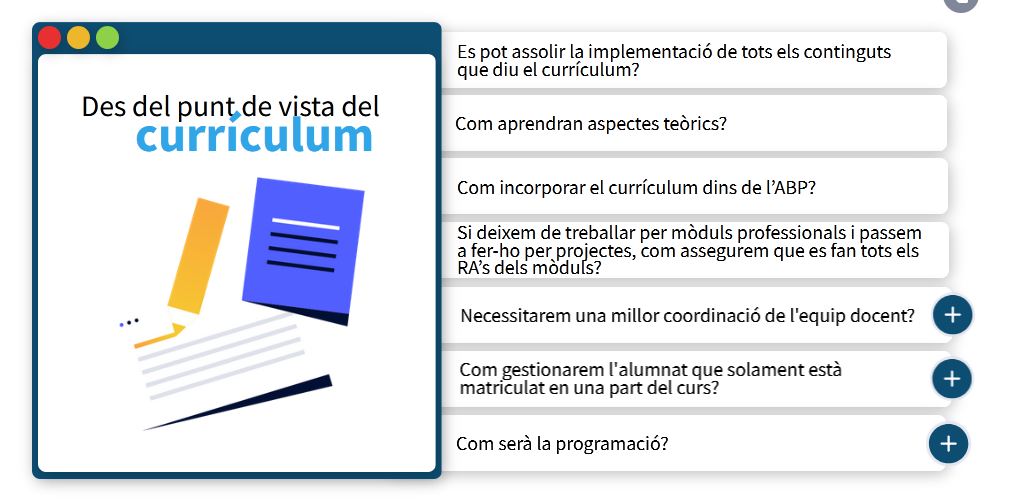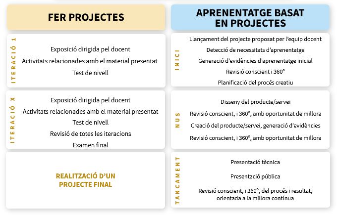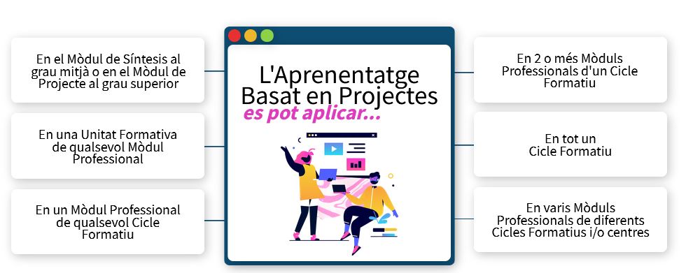 • 7 El projecte passa a ser l’eix vertebrador dels aprenentatges, per tenir una visió integrada de tots els continguts. Els quals estan relacionats amb les competències professionals del món laboral.