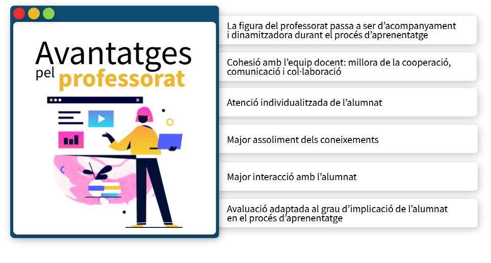• 4 L’alumnat és el protagonista del seu procés d’aprenentatge, i per tant, el professorat que és imprescindible canvia el seu rol a mentor, orientador, observador, organitzador, etc.