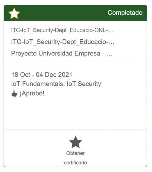 Seguridad en IoT – Curso oficial IoT Security de Cisco Systems organizado por el Departament d’Educació e impartido por PUE. Me confirman que he completado la formación, y…