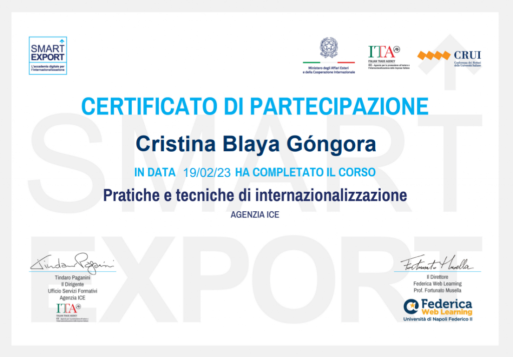 Il progetto nasce dalla collaborazione tra Ministero degli Affari Esteri e della Cooperazione Internazionale (MAECI), ICE-Agenzia per la promozione all’estero e l’internazionalizzazione delle imprese italiane (Agenzia ICE) e Conferenza dei Rettori delle Università italiane (CRUI). Smart Export si articola in 6 percorsi formativi ciascuno composto da 5 lezioni, fruibili on-line nell’arco di dodici mesi.