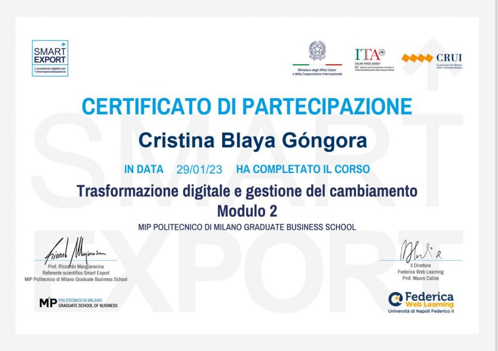 Oggi mi ho dedicato a finire questo corso dove si tratta la trasformazione digitale con lo smart working, esempi de chatbots, intelligencia artificiale, learning machine, deep learning, eccetera.