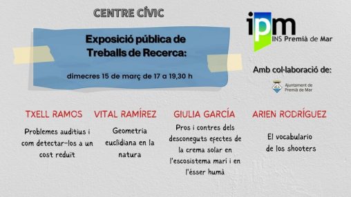 El 15 de març, de 17 a 19:30, al Centre Cívic, es va dur a terme una exposició de quatre treballs de recerca d’alumnes de batxillerat de l’Institut Premià…