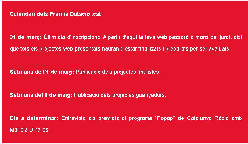 El dia 31 de març de 2023 s’han de presentar els projectes web acabats.  A partir d’aquí els vostres webs passaran a mans del jurat. La setmana del 8 de maig de 2023 es publicaran els projectes guanyadors. Finalment, a una data encara per concretar s’entrevistarà als premiats al programa “Popap” de Catalunya Ràdio.