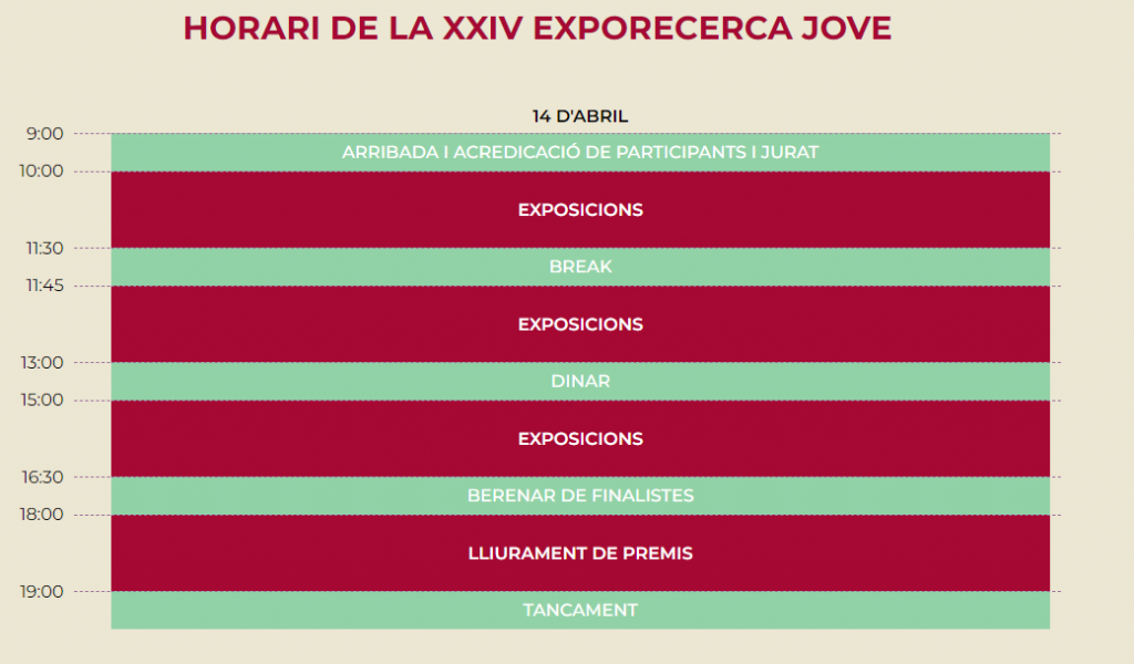 - És obligatori assistir a les presentacions de tots els finalistes, al berenar i al Lliurament de Premis de la Final de la XXIV Exporecerca Jove.
