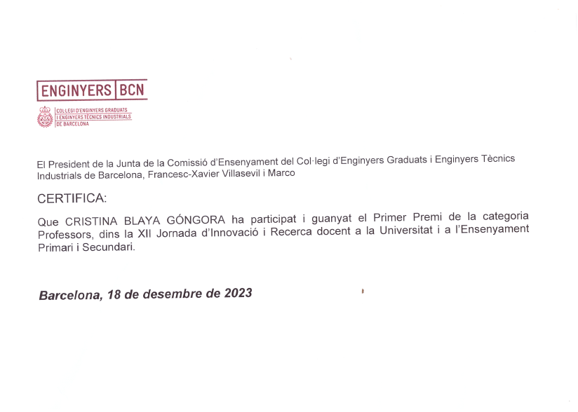 Des d’Enginyers BCN, i concretament des de la Comissió Ensenyament i dels Grup de Recerca i Innovació en la Formació Tecnològica i GENCAD UPC, per incentivar les vocacions tècniques entre els mes joves i motivar al  professorat de tots els nivells educatius han instaurat diversos premis per aquest 2023.