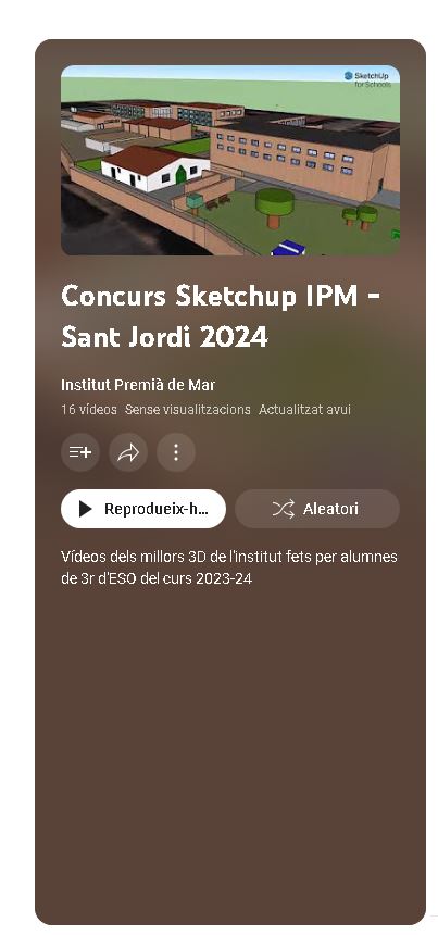 Us comparteixo el llistat de reproducció del youtube dels vídeos del IPM en 3D que varem fer a Tecnologia amb Sketch Up. Recordeu que el primer i segon vídeo…