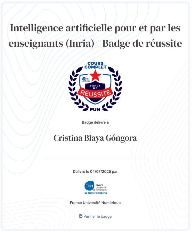 Ce badge est destiné aux apprenants ayant suivi avec succès le cours. Les applications et technologies d’IA sont maintenant intégrées dans nos usages quotidiens. Elles s’invitent aussi dans l’éducation avec, par exemple, la traduction automatique de textes, le dialogue avec un chatbot pédagogique ou la recommandation automatique de ressources éducatives. Ce cours a pour objectif d’aider les enseignants et la communauté éducative dans son ensemble à acquérir une compréhension générale sur l’IA – ses usages, ses technologies et ses limites, et à les accompagner vers un usage éclairé des outils basés sur l’IA dans le contexte de l’Éducation.