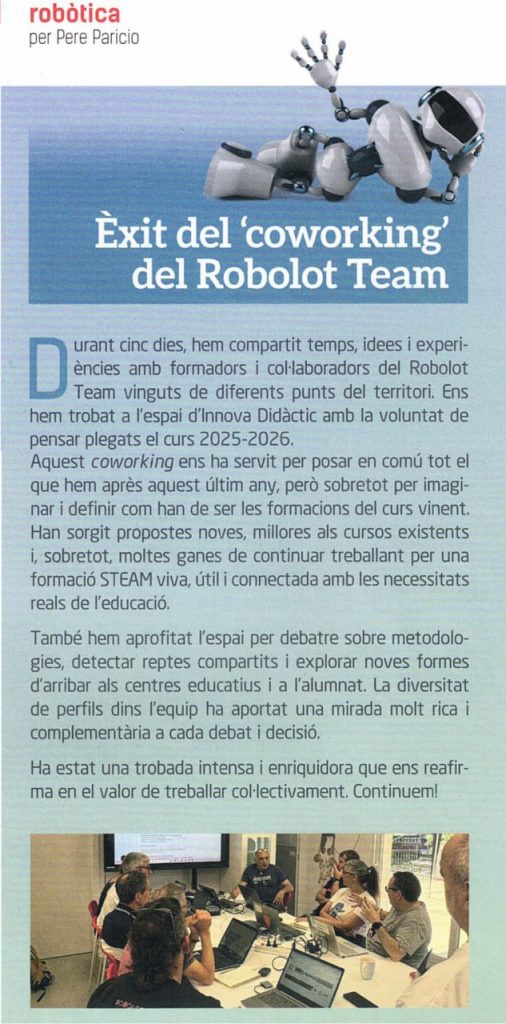 Durant aquesta setmana, del 14 al 18 de juliol, he estat treballant al coworking de Robolot, un espai creatiu i col·laboratiu on hem dedicat temps i energia a dissenyar i planificar els cursos del proper any. Ha estat una experiència molt enriquidora, envoltat de grans professionals amb qui ha estat un plaer compartir idees, debat i complicitats. Marxo amb la motxilla plena d’aprenentatges, bones sensacions i moltes ganes d’engegar els nous projectes.