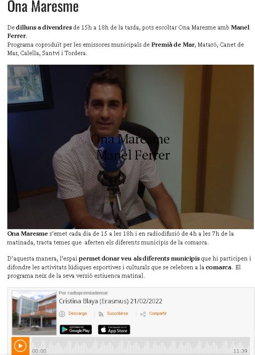 El 21 de febrer m’ha entrevistat Manel Ferrer a Ona Maresme – Ràdio Premià de Mar per explicar com treballem l’Erasmus Sonolux a casa nostra.