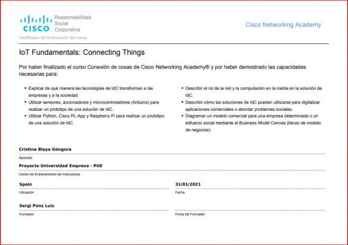 He finalitzat els meus cursos d’Internet de les coses a CISCO Networking Academy que em qualifica com a instructora en IOT.