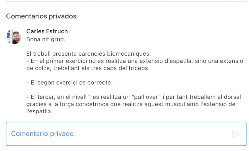 Pel que fa a la comunicació amb l’alumnat, utilitze la plataforma “Classroom”, doncs en aquesta, els discents annexen tots les seues tasques per tal de ser avaluades. Així, habitualment, envie “feedbacks” personals i puje tots els documents necessaris per tal de guiar-los en el procés d’ensenyança aprenentatge i que la seua formació sigui significativa. A continuació, mostre una captura d’una correcció d’una tasca relacionada amb el control postural.