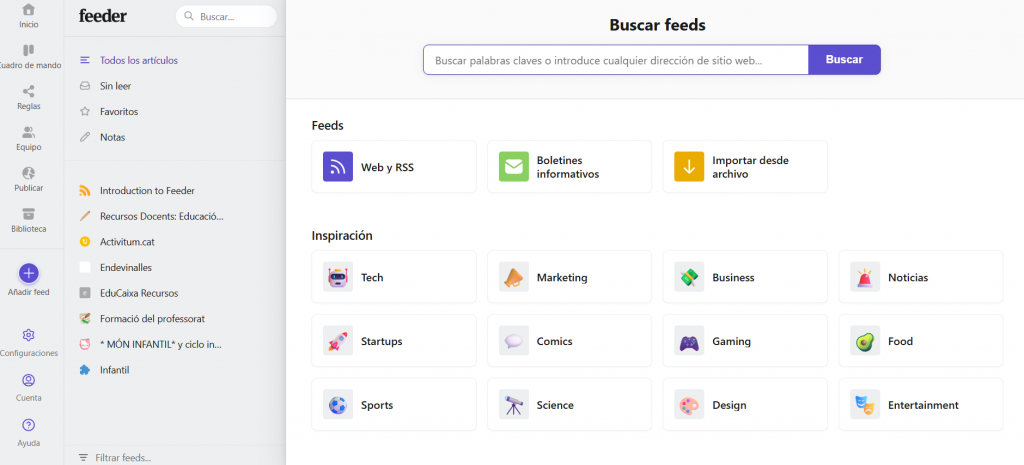 Finalment, vaig comprovar que l’extensió funcionava correctament, tot i que en algunes ocasions necessita una mica de temps per carregar-se. A més, cal tenir en compte que no totes les webs es poden afegir, cosa que limita una mica el seu ús. Un cop superades aquestes dificultats inicials, vaig descobrir que Feeder té diversos punts positius pel que fa a l’organització dels recursos, ja que permet tenir-los ordenats i classificats de manera clara.