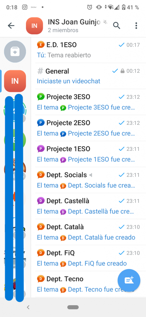 - Organització de grups en carpetes. Es crearan carpetes de canals (difusió de missatges) i grups (contacte entre docents) que englobin:
