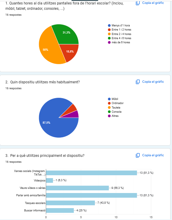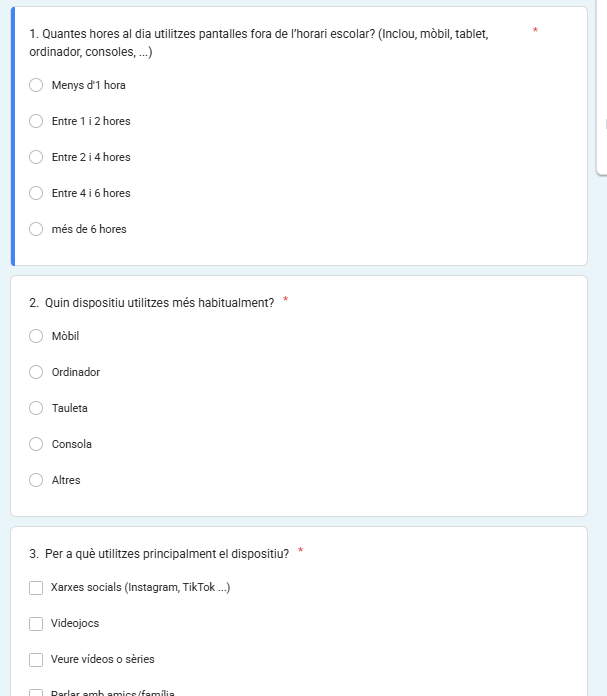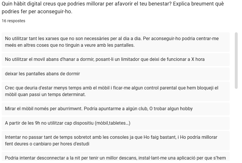 En primer lloc, l’alumnat respon de manera individual i anònima un formulari digital (Google Forms) sobre els seus hàbits digitals quotidians, que inclou aspectes com el temps de pantalla, els moments d’ús, la percepció del descans, la concentració i l’impacte emocional de l’ús de dispositius.