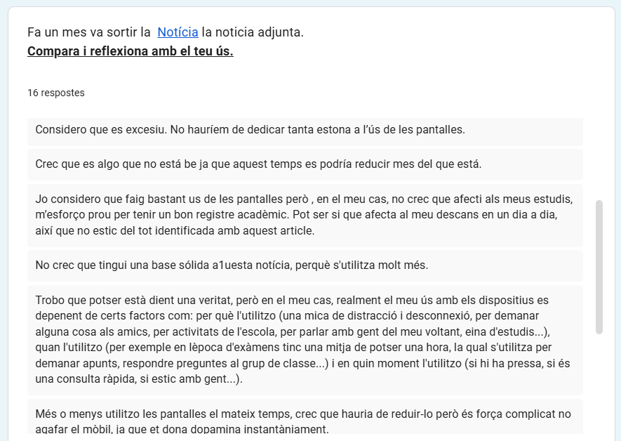 - Desenvolupament del pensament crític davant la informació: La reflexió a partir de la notícia sobre l’ús de xarxes socials a Espanya ha generat un debat molt ric. L’alumnat ha estat capaç de qüestionar les mitjanes estadístiques i diferenciar entre “temps d’ús” i “qualitat de l’ús” (ex: “podem passar 3 hores fent-ne un bon ús”). Les respostes mostren que són conscients de la cerca de “dopamina instantània” que ofereixen les pantalles i de com l’avorriment és el principal motor del seu consum.
