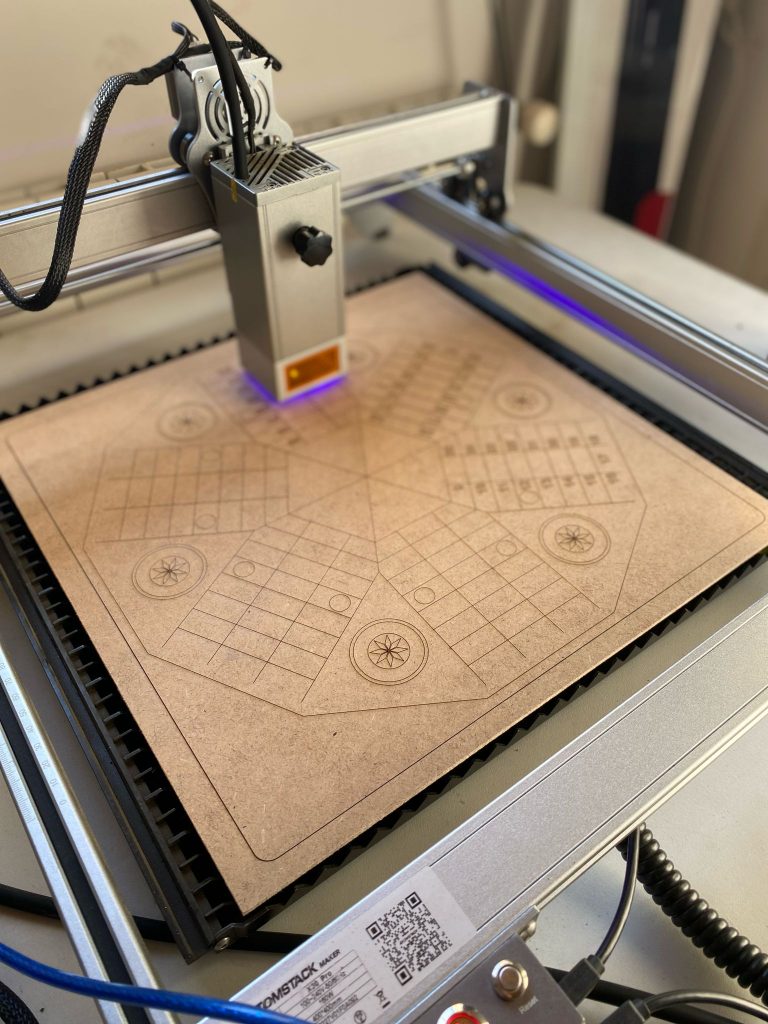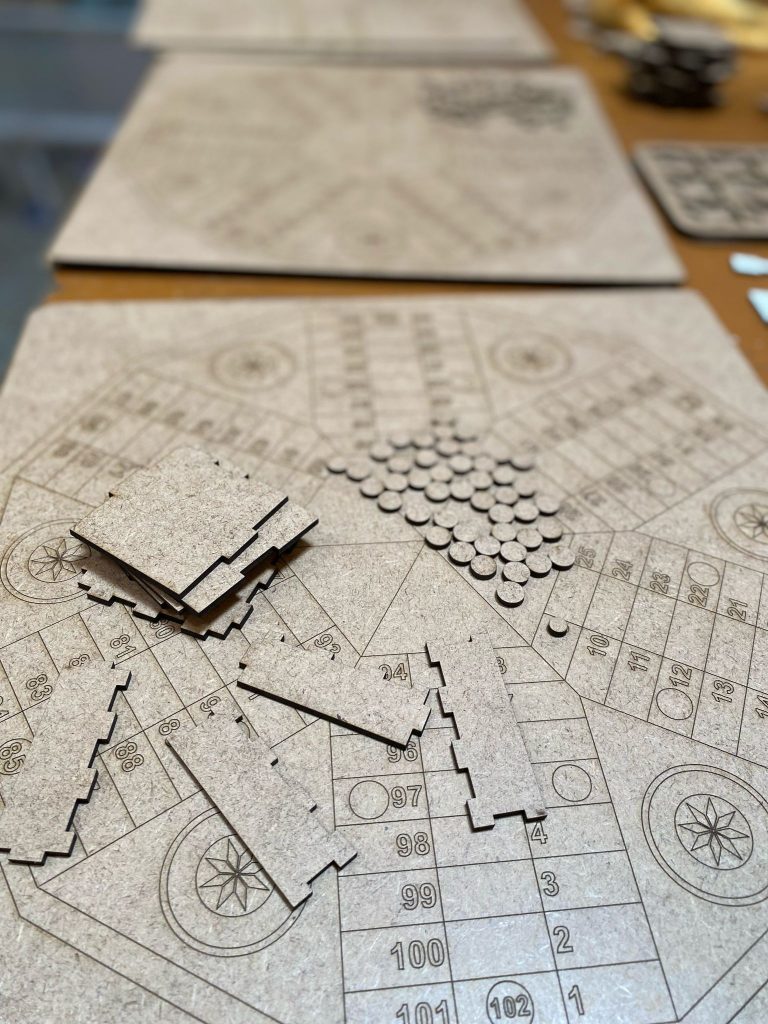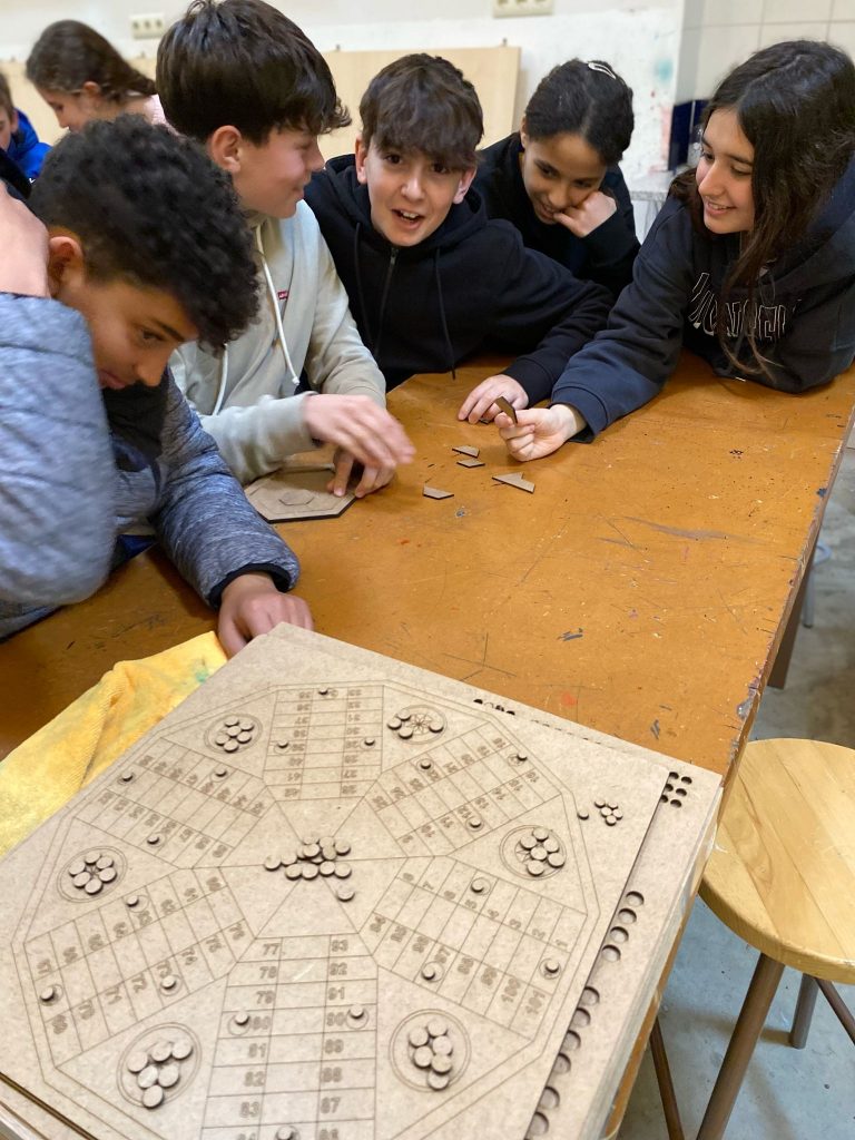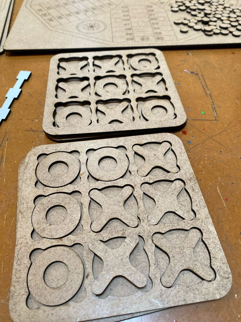 Aprofitant les possibilitats que té el treball amb planxes de fusta DM de 40 x 40 cm (que és el material que hem utilitzat amb la nostra talladora làser), hem desenvolupat una gamma variada de jocs de taula per complementar els ja existents a l’aula. Els jocs que hem creat inclouen 3 en línia, connecta 4, hockey, domino de triangles, el joc de les serps i les escales, mini-domino, i parxís doble (per a 4 i 6 jugadors).