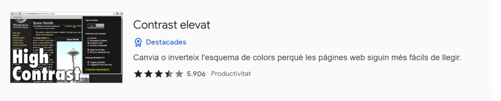 - “Contraste alto”: aquesta extensió canvia els colors de les pàgines web i les fa més fàcil de llegir per a persones amb discapacitats visuals o amb problemes de percepció de colors. En l’aplicació a l’aula pot invertir els colors de fons de les pàgines que l’alumnat cerca i del text, amb l’idea de crear un contrast més fort per facilitar la lectura. També pot canviar els colors de fons i de text per a fer-los més clars i fàcils de distingir als alumnes amb dificultats lectores i/o visuals.