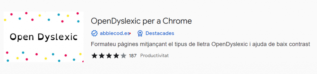 - Open dislèxic para Chrome”: aquesta extensió ajuda a les persones amb dislèxia a llegir contingut en línia. Inclou diverses funcions útils per a les nostres aules: possibilitat de canviar la font i el color del text per a fer-lo més fàcil de llegir, ocultar imatges o vídeos que poden distreure l’atenció de la lectura de l’alumnat.