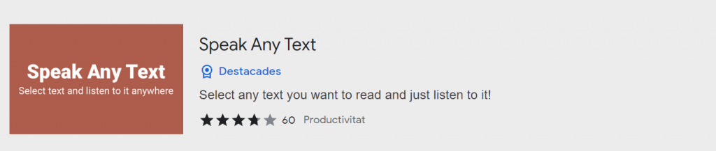 - “Speak any text”: aquesta extensió converteix el text escrit en parlat. És útil en les nostres aules per a l’alumnat amb discapacitats visuals o dificultats per llegir. Per exemple, si un alumne té dificultats per llegir un article en línia, pot utilitzar aquesta extensió per a escoltar el text en lloc de llegir-lo, o per corroborar que el que ha llegit és correcte.