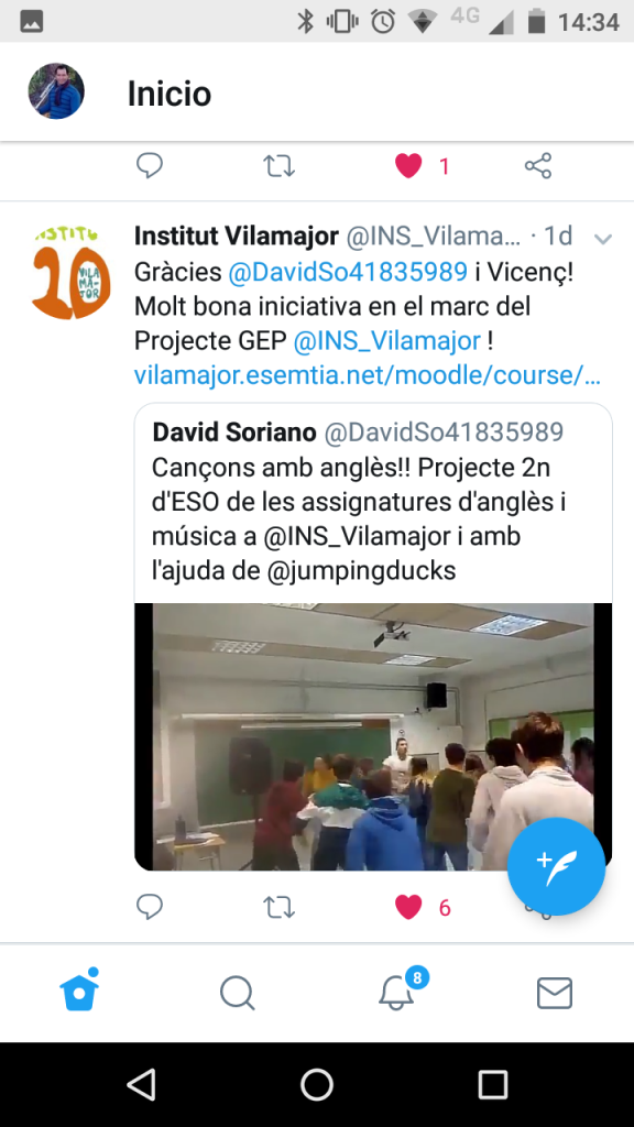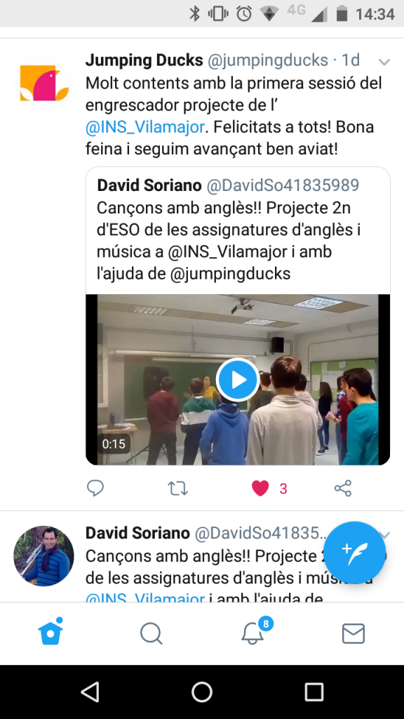 Fins aquí jo continuava pensant que el Twitter no el faria servir, però abans de seguir a @Xatac5, que era una pràctica obligatòria, vaig decidir el dissabte al matí, penjar un petit vídeo d’un taller de cantar amb anglès que vam fer a l’Institut amb una empresa externa, activitat que per als alumnes va resultar bastant motivadora. Al tuit vaig anomenar tant a l’Institut com a Jumping Ducks que era l’empresa que va venir al centre a realitzar els tallers. Abans de migdia l’Institut i Jumping Ducks ja s’havien interessat pel tuit i ens felicitarem mútuament perquè l’activitat va anar molt bé.