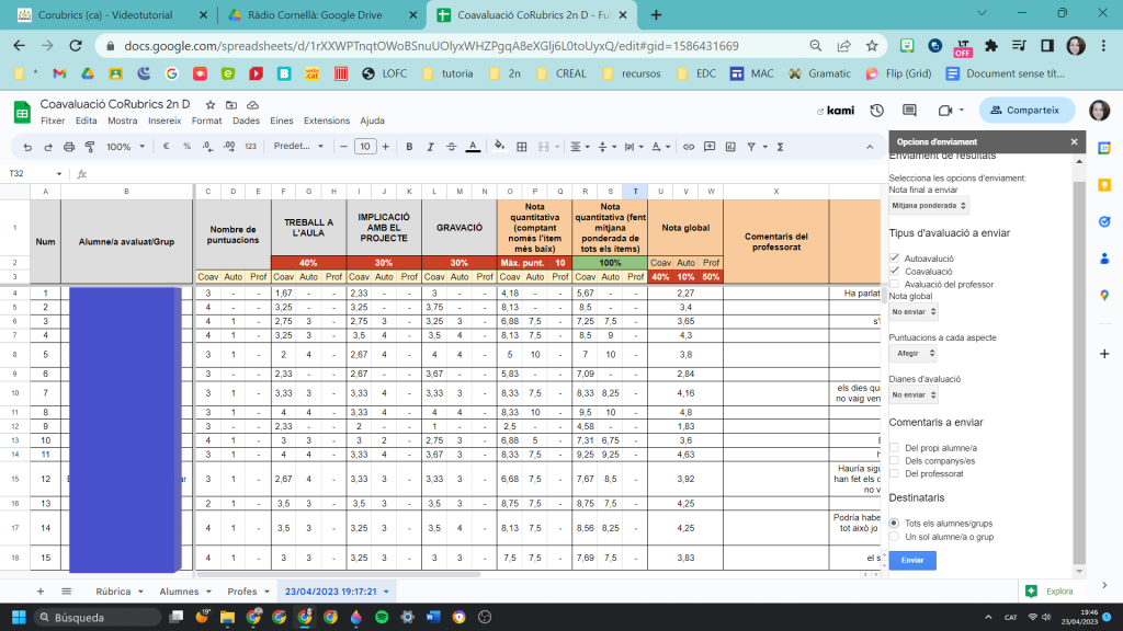 Quan tots els alumnes han contestat es poden processar les dades i donar feedback. Jo els he enviat per correu, però hi ha un gran ventall de possibilitats per fer una retroalimentació.