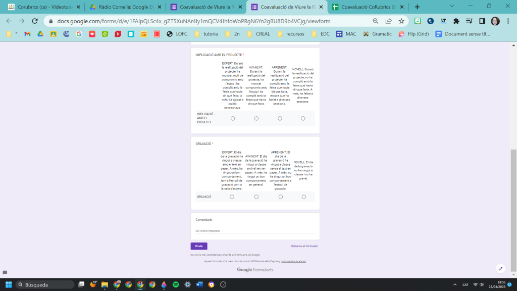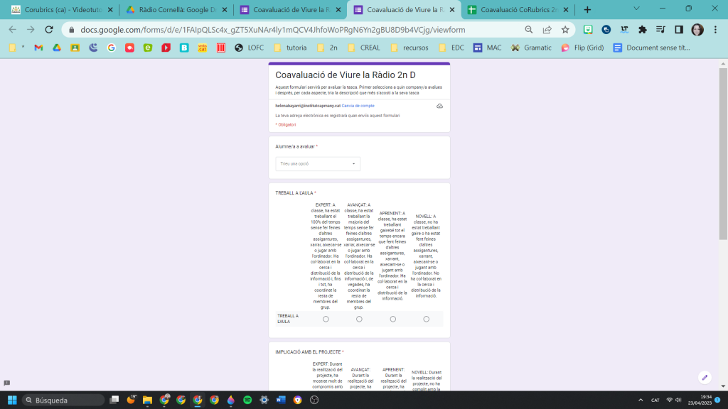 L’any passat vaig fer un formulari simple per realitzar la coavaluació, però em va costar extreure una nota d’entre totes les respostes. Així i tot, em semblava un aspecte molt important a tenir en compte a l’hora de posar la nota final del projecte.