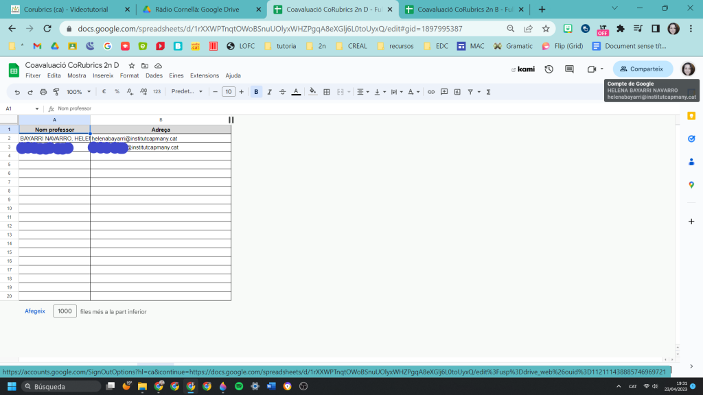 En els altres dos llibres s’han de posar les dades dels alumnes i dels professors. En el meu cas les he importat des del meu Classroom. A l’apartat de professors, surt també el profe d’aula d’acollida, ja que un dia a la setmana entra a fer suport lingüístic a la meua aula i és al Classroom.