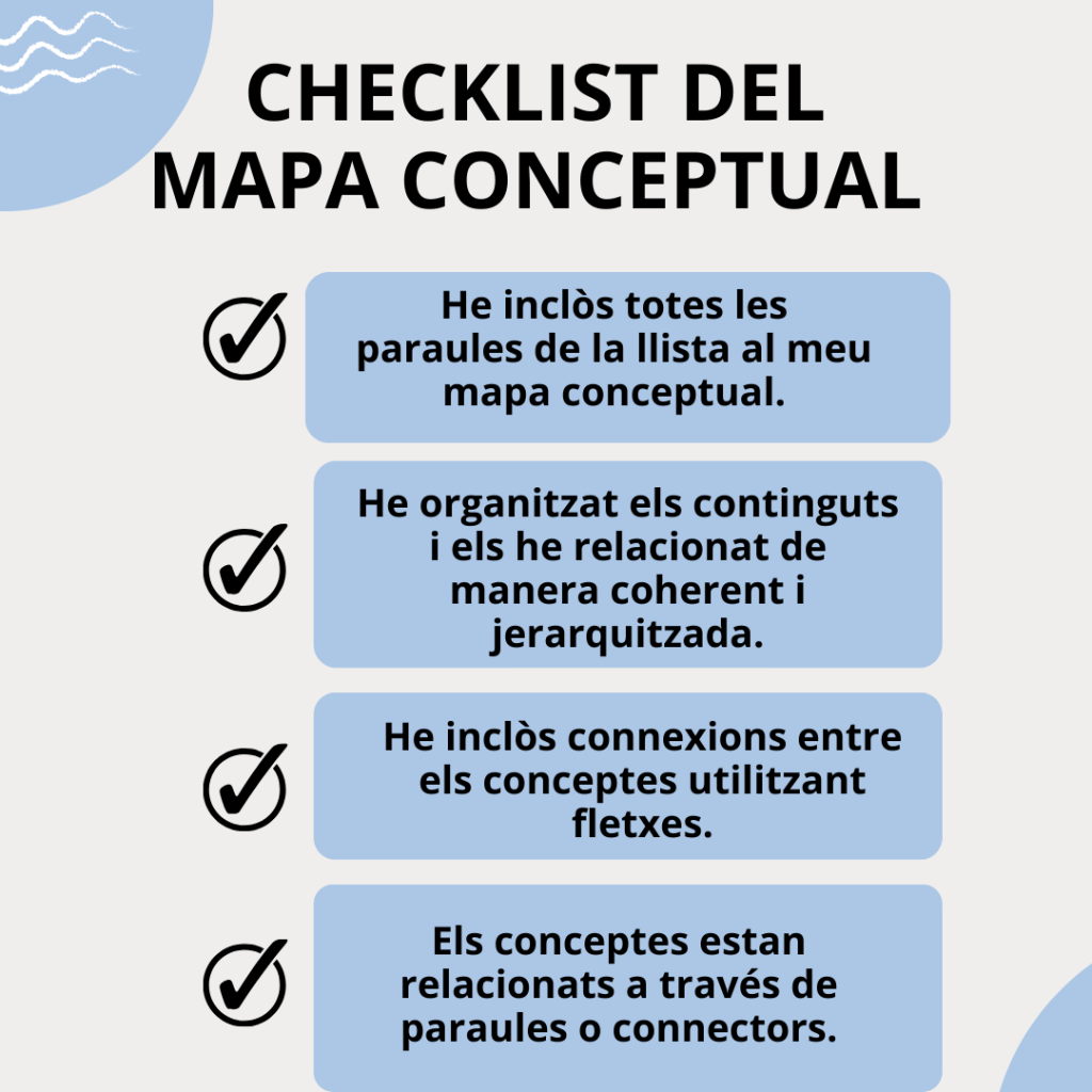 Per tal d’ajudar a autoregular el seu aprenentatge, sel’s faria revisar un “checklist” en finalitzar el seu mapa conceptual, amb la finalitat d’ajudar-los a aprendre a aprendre. El document s’adjunta a continuació:
