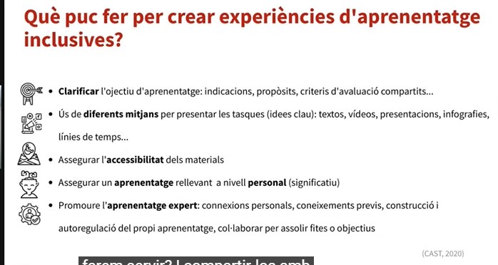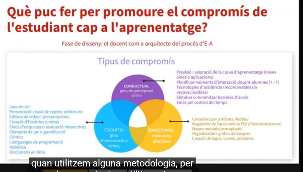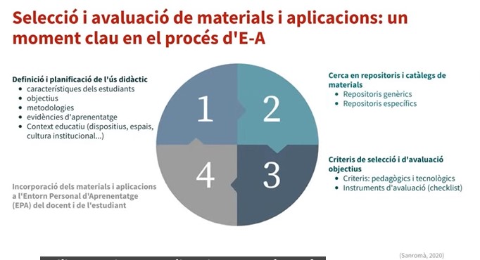 - L’objectiu al centre: un dels conceptes més repetits per tots els ponents és el fet que no s’ha de triar primer l’eina digital, sinó que s’ha de promocionar primer quin és l’objecte d’aprenentatge que volem que en treguin els alumnes i després triar l’eina més adequada perquè l’assoleixin. A més a més, hi ha el procés de decisió de l’eina per qüestions d’accessibilitat, personalització del repte, etc.