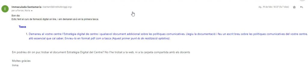 - una és un correu a una de la persona que s’encarrega del moodle de l’institut i en aquests moments també fa tasques de coordinadora TAC